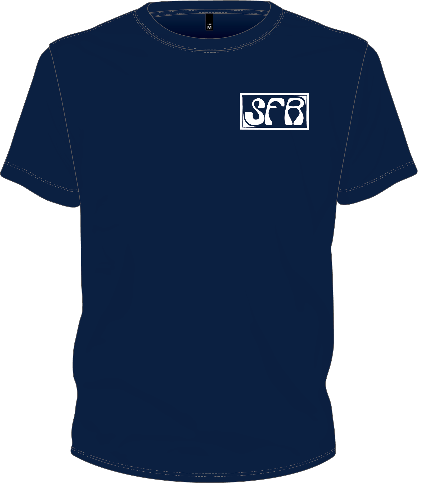 A Navy San Francisco Randonneurs T-Shirt, printed in white on a Comfort Colors Heavy Weight 100% cotton t-shirt using waterbased inks. Sizing can be found here